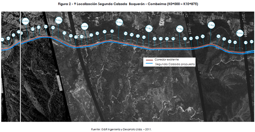 La segunda calzada se proyecta ocupando, en la mayor parte de su recorrido, una franja paralela a la vía existente, y en algunos tramos para sortear las condiciones especiales el nuevo corredor se apartaría de la vía actual; este espaciamiento respecto al corredor existente no supera los 50 metros, lo que permite considerar que la segunda calzada se materializará prácticamente dentro de la misma zona ambiental intervenida comose observa en la Figura 2 – 8 y Figura 2 – 9 y en el Anexo 2- 1 Diseño Geométrico Boquerón – Combeima- Planos No GIC_TR5B TR DG PP01 V1 al GIC_TR5B TRDG PP18 V1.
